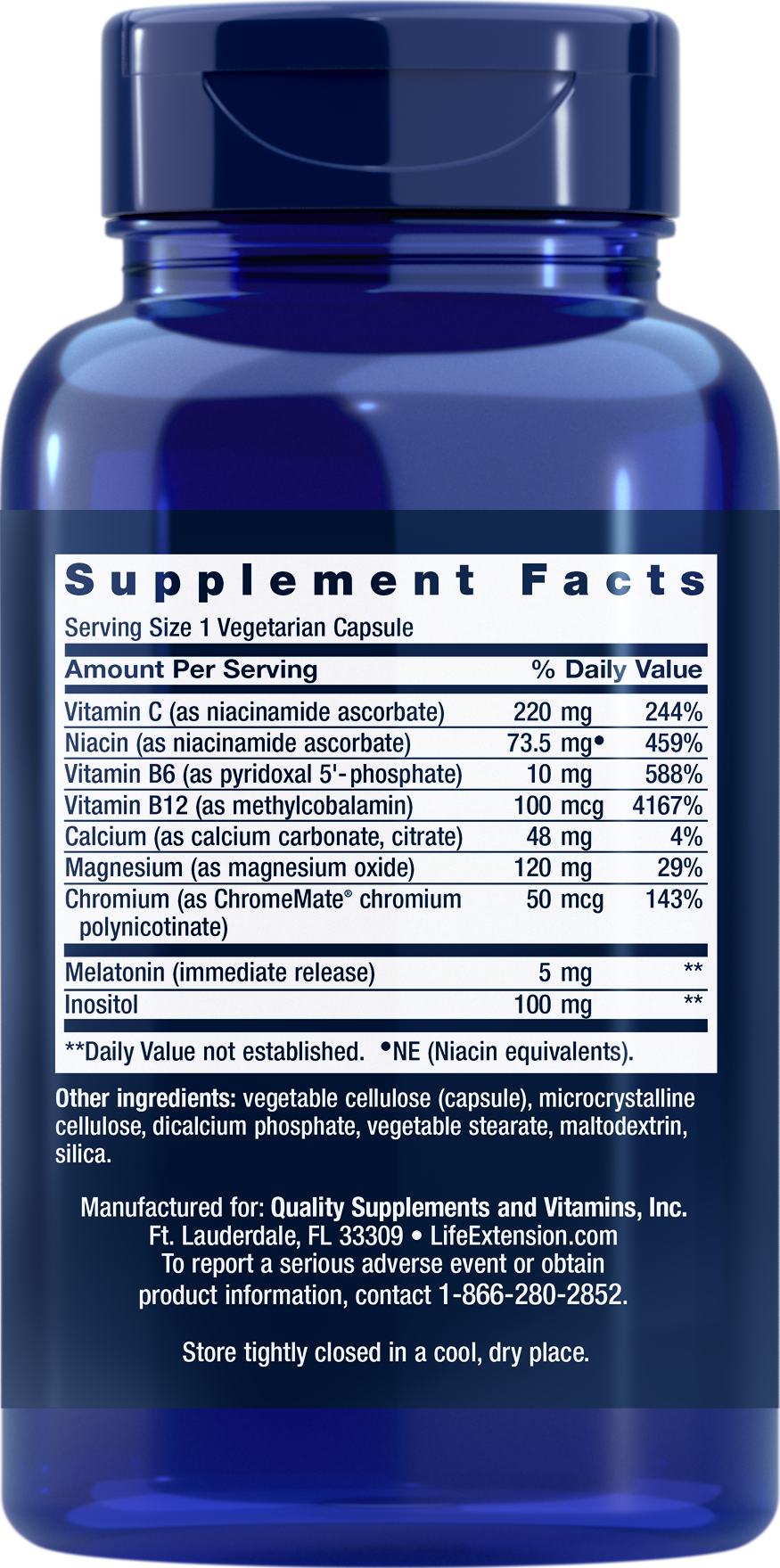 Quiet Sleep é um suplemento abrangente de suporte ao sono. Combina 5 mg de liberação imediata com vitamina C, B12, inositol e muito mais para promover o sono saudável.