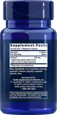 Aged Black Garlic da Life Extension é um suplemento uma vez ao dia que entrega 500 mg de extrato de alho negro envelhecido, padronizado para 2,5 mg de S-allyl-cysteine (SAC), um potente antioxidante que promove a saúde do coração, ajuda a manter a pressão arterial, colesterol e triglicerídeos em níveis saudáveis. É vegetariano, sem glúten e não transgênico (Non-GMO).